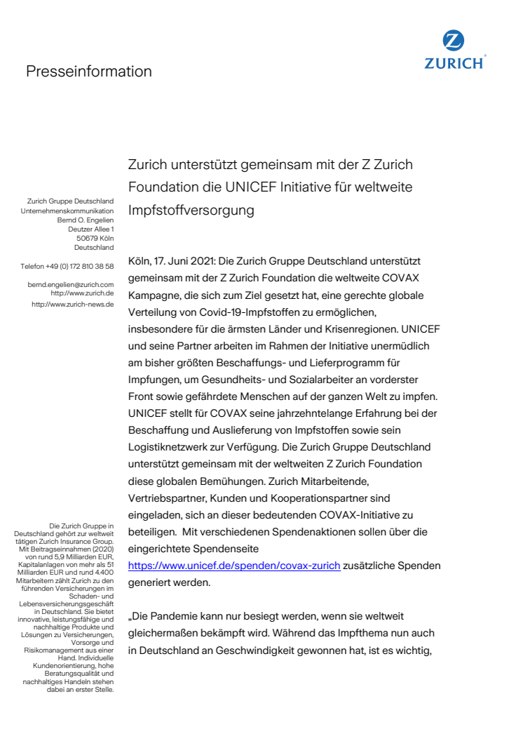 Die Zurich Gruppe Deutschland unterstützt gemeinsam mit der Z Zurich Foundation die weltweite COVAX Kampagne, die sich zum Ziel gesetzt hat, eine gerechte globale Verteilung von Covid-19-Impfstoffen zu ermöglichen, insbesondere für die ärmsten Länder und Krisenregionen.