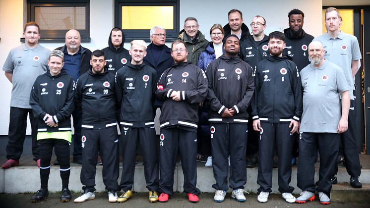 Die Ü17-Inklusionsmannschaft von Viktoria Köln. Mit auf dem Foto sind neben Viktoria-Geschäftsführer Norbert Bruhn (oben, 4.v.l.) auch Sportamtsleiter Gregor Timmer, Monika Schulze, Head of Customer & Innovation Management der Zurich Gruppe Deutschland, und Robert Voigtsberger, Dezernent für Sport, Bildung & Jugend der Stadt Köln. (Foto: Besnik Abazaj/Viktoria Köln)