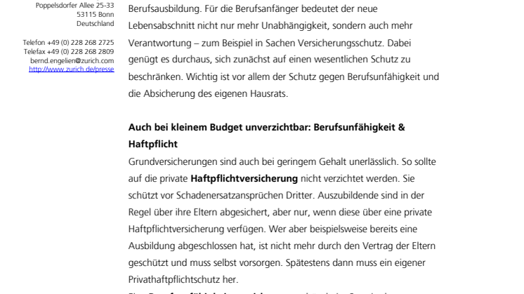 Bonn, 31. August 2016 Am 1. September ist offizieller Ausbildungsstart in Deutschland. Viele, vor allem junge Menschen starten mit ihrer Berufsausbildung. Für die Berufsanfänger bedeutet der neue Lebensabschnitt nicht nur mehr Unabhängigkeit, sondern auch mehr Verantwortung – zum Beispiel in Sachen Versicherungsschutz. Dabei genügt es durchaus, sich zunächst auf einen wesentlichen Schutz zu beschränken. Wichtig ist vor allem der Schutz gegen Berufsunfähigkeit und die Absicherung des eigenen Hausrats.