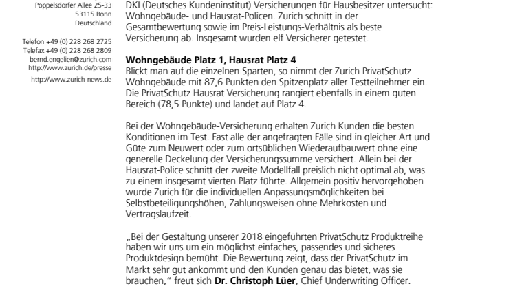 Das Magazin €uro am Sonntag hat zusammen mit dem DKI (Deutsches Kundeninstitut) Versicherungen für Hausbesitzer untersucht: Wohngebäude- und Hausrat-Policen. Zurich schnitt in der Gesamtbewertung sowie im Preis-Leistungs-Verhältnis als beste Versicherung ab. Insgesamt wurden elf Versicherer getestet.