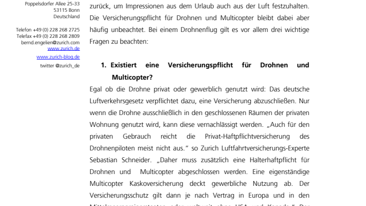 Egal ob die Drohne privat oder gewerblich genutzt wird: Das deutsche Luftverkehrsgesetz verpflichtet dazu, eine Versicherung abzuschließen. Nur wenn die Drohne ausschließlich in den geschlossenen Räumen der privaten Wohnung genutzt wird, kann diese vernachlässigt werden. „Auch für den privaten Gebrauch reicht die Privat-Haftpflichtversicherung des Drohnenpiloten meist nicht aus.“ so Zurich Luftfahrtversicherungs-Experte Sebastian Schneider. „Daher muss zusätzlich eine Halterhaftpflicht für Drohnen undMulticopter abgeschlossen werden. Eine eigenständige Multicopter Kaskoversicherung deckt gewerbliche Nutzung ab. Der Versicherungsschutz gilt dann je nach Vertrag in Europa und in den Mittelmeeranrainerstaaten oder weltweit ohne USA und Kanada.“ Der Einsatz von Drohnen oder Multicopter ist somit auch im Urlaub außerhalb von Deutschland abgesichert.