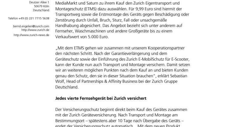Köln, 28. Oktober 2020 - Die erfolgreiche Kooperation mit MediaMarkt und Saturn in Deutschland wird erweitert: Kunden von MediaMarkt und Saturn können nun zu ihrem Kauf den Zurich Eigentransport- und Montageschutz (ETMS) auswählen. Für 9,99 Euro sind hiermit der Transportweg sowie die Erstmontage des Geräts gegen Beschädigung oder Zerstörung durch Unfall, Bruch, Sturz, Fall oder unsachgemäße Handhabung abgesichert. Das Angebot bezieht sich unter anderem auf Fernseher, Waschmaschinen und andere Großgeräte bis zu einem Verkaufswert von 5.000 Euro.