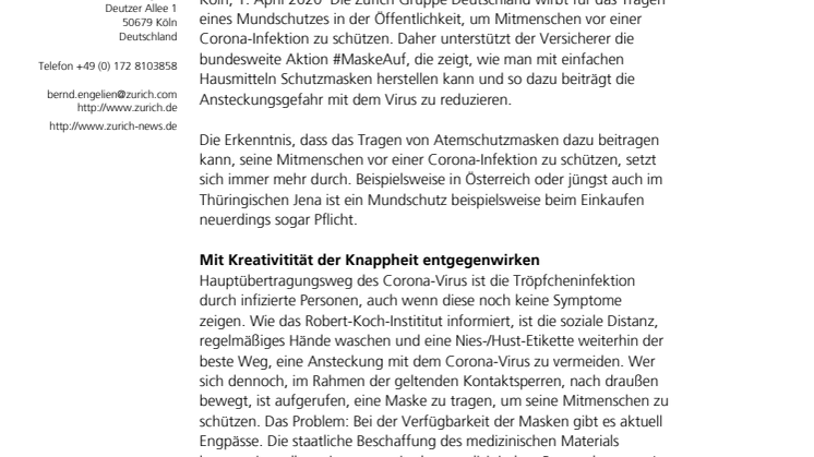 Köln, 1. April 2020 Die Zurich Gruppe Deutschland wirbt für das Tragen eines Mundschutzes in der Öffentlichkeit, um Mitmenschen vor einer Corona-Infektion zu schützen. Daher unterstützt der Versicherer die bundesweite Aktion #MaskeAuf, die zeigt, wie man mit einfachen Hausmitteln Schutzmasken herstellen kann und so dazu beiträgt die Ansteckungsgefahr mit dem Virus zu reduzieren.