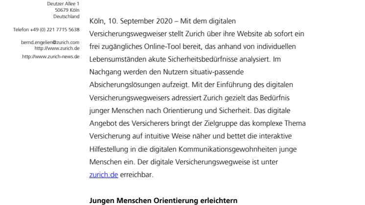 Köln, 10.09.2020 – Mit dem digitalen Versicherungswegweiser stellt Zurich über ihre Website ab sofort ein frei zugängliches Online-Tool bereit, das anhand von individuellen Lebensumständen akute Sicherheitsbedürfnisse analysiert. Im Nachgang werden den Nutzern situativ-passende Absicherungslösungen aufzeigt. Mit der Einführung des digitalen Versicherungswegweisers adressiert Zurich gezielt das Bedürfnis junger Menschen nach Orientierung und Sicherheit. Das digitale Angebot des Versicherers bringt der Zielgruppe das komplexe Thema Versicherung auf intuitive Weise näher und bettet die interaktive Hilfestellung in die digitalen Kommunikationsgewohnheiten junge Menschen ein. Der digitale Versicherungswegweise ist unter zurich.de erreichbar.