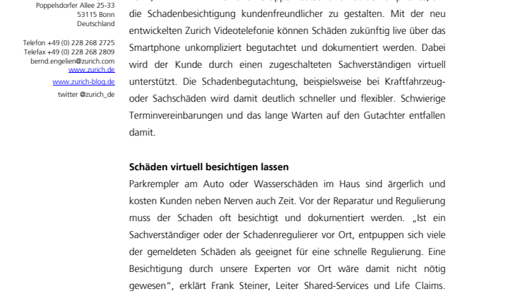 Bonn, 02.05.2018 - Die Zurich Gruppe Deutschland nutzt Smartphones, um die Schadenbesichtigung kundenfreundlicher zu gestalten. Mit der neu entwickelten Zurich Videotelefonie können Schäden zukünftig live über das Smartphone unkompliziert begutachtet und dokumentiert werden. Dabei wird der Kunde durch einen zugeschalteten Sachverständigen virtuell unterstützt. Die Schadenbegutachtung, beispielsweise bei Kraftfahrzeug- oder Sachschäden wird damit deutlich schneller und flexibler. Schwierige Terminvereinbarungen und das lange Warten auf den Gutachter entfallen damit.