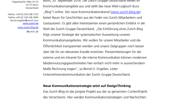 Bonn, 20. September 2016: Die Zurich Gruppe Deutschland weitet ihr Kommunikationsangebot aus und stellt das neue Web-Logbuch (kurz „Blog“) online. Der neue Kommunikationskanal (www.zurich-blog.de) bietet Raum für Geschichten aus der Feder von Zurich Mitarbeitern und Gastautoren. Es gibt allen Interessierten einen persönlichen Einblick in die Welt der Zurich Gruppe Deutschland. „Die Einführung eines Zurich Blog folgt unserer Strategie der systematischen Ausweitung unseres Kommunikationsangebotes. Wir wollen für unsere Mitarbeiter und die Öffentlichkeit transparenter werden und unsere Zielgruppen noch besser über die für sie relevanten Kanäle erreichen. Pressemitteilungen für die externe und ein Intranet für die interne Kommunikation können modernen Mediennutzungsgewohnheiten hier einfach nicht mehr in ausreichendem Maße Rechnung tragen“, so Bernd O. Engelien, Leiter Unternehmenskommunikation der Zurich Gruppe Deutschland.