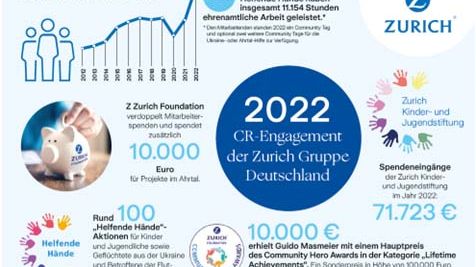 “Im vergangenen Jahr 2022 konnten wir unsere Ambitionen im Bereich CSR erneut untermauern und unser Engagement auf einen Rekordwert von 1997 Community Tagen mit insgesamt 11.154 Stunden ehrenamtlicher Betätigung der Belegschaft steigern, “ erklärt Bernd O. Engelien. „Deutschlandweit fanden im vergangenen Jahr 100 Aktionen der ‚Helfenden Hände‘ statt. Zusätzlich konnten soziale Projekte für kranke und benachteiligte Kinder über unsere Zurich Kinder- und Jugendstiftung in Höhe von mehr als 70.000 Euro Spenden gefördert werden.“
