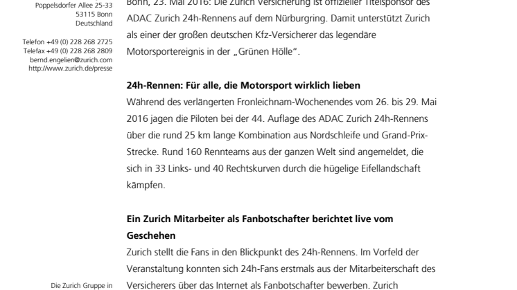 Veranstaltung konnten sich 24h-Fans erstmals aus der Mitarbeiterschaft des Versicherers über das Internet als Fanbotschafter bewerben. Zurich Mitarbeiter Viktor Knor hat sich für diese besondere Aufgabe qualifiziert. Er wird den Blick hinter die Kulissen werfen, den sonst kein Fan erleben kann. Über seine Eindrücke und Gefühle wird er live und exklusiv für die Fangemeinde in Facebook und Internet berichten. Alle am Ring Campierenden oder auch Daheimgebliebenen sind so über die Zurich Online-Plattformen ganz nah am Geschehen.