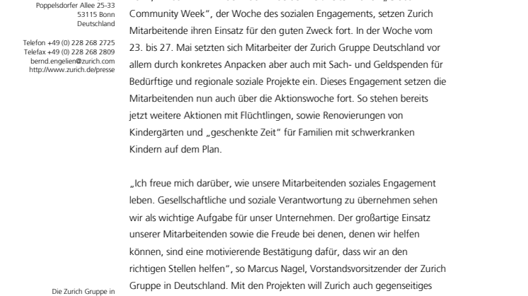 „Ich freue mich darüber, wie unsere Mitarbeitenden soziales Engagement leben. Gesellschaftliche und soziale Verantwortung zu übernehmen sehen wir als wichtige Aufgabe für unser Unternehmen. Der großartige Einsatz unserer Mitarbeitenden sowie die Freude bei denen, denen wir helfen können, sind eine motivierende Bestätigung dafür, dass wir an den richtigen Stellen helfen“, so Marcus Nagel, Vorstandsvorsitzender der Zurich Gruppe in Deutschland. Mit den Projekten will Zurich auch gegenseitiges Verständnis und gesellschaftliche Toleranz fördern. Über das gesamte Jahr engagieren sich voraussichtlich mehr als 1.200 Zurich Mitarbeiter in Deutschland.
