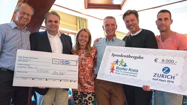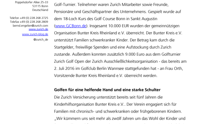Bonn, 21. September 2016 Die Zurich Gruppe in Deutschland lud am vergangenen Wochenende zum fünften Mal in Folge zum Zurich Benefiz-Golf-Turnier. Teilnehmer waren Zurich Mitarbeiter sowie Freunde, Pensionäre und Geschäftspartner des Unternehmens. Gespielt wurde auf dem 18-Loch Kurs des Golf Course Bonn in Sankt Augustin. Insgesamt 10.000 EUR wurden der gemeinnützigen Organisation Bunter Kreis Rheinland e.V. überreicht. Der Bunter Kreis e.V. unterstützt Familien schwerkranker Kinder. Der Betrag kam durch die Startgelder, freiwillige Spenden und eine Aufstockung durch Zurich zustande. Außerdem konnten zusätzlich 9.000 Euro aus dem Golfturnier Zurich Golf Open der Zurich Ausschließlichkeitsorganisation - das bereits am 2. Juli 2016 im Golfclub Berlin Wannsee stattgefunden hat - an Frau Orth, Vorsitzende Bunter Kreis Rheinland e.V. überreicht werden.