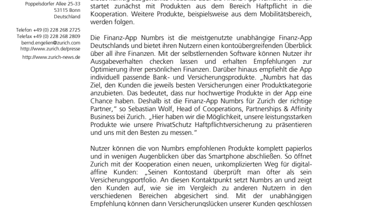 Die Finanz-App Numbrs ist die meistgenutzte unabhängige Finanz-App Deutschlands und bietet ihren Nutzern einen kontoübergreifenden Überblick über all ihre Finanzen. Mit der selbstlernenden Software können Nutzer ihr Ausgabeverhalten checken lassen und erhalten Empfehlungen zur Optimierung ihrer persönlichen Finanzen. Darüber hinaus empfiehlt die App individuell passende Bank- und Versicherungsprodukte. „Numbrs hat das Ziel, den Kunden die jeweils besten Versicherungen einer Produktkategorie anzubieten. Das bedeutet, dass nur hochwertige Produkte in der App eine Chance haben. Deshalb ist die Finanz-App Numbrs für Zurich der richtige Partner,“ so Sebastian Wolf, Head of Cooperations, Partnerships & Affinity Business bei Zurich. „Hier haben wir die Möglichkeit, unsere leistungsstarken Produkte wie unsere PrivatSchutz Haftpflichtversicherung zu präsentieren und uns mit den Besten zu messen.“