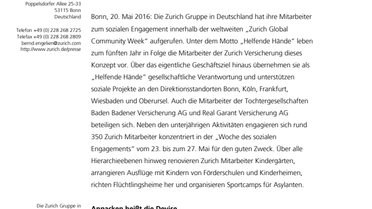 Bonn, 20. Mai 2016: Die Zurich Gruppe in Deutschland hat ihre Mitarbeiter zum sozialen Engagement innerhalb der weltweiten „Zurich Global Community Week“ aufgerufen. Unter dem Motto „Helfende Hände“ leben zum fünften Jahr in Folge die Mitarbeiter der Zurich Versicherung dieses Konzept vor. Über das eigentliche Geschäftsziel hinaus übernehmen sie als „Helfende Hände“ gesellschaftliche Verantwortung und unterstützen soziale Projekte an den Direktionsstandorten Bonn, Köln, Frankfurt, Wiesbaden und Oberursel. Auch die Mitarbeiter der Tochtergesellschaften Baden Badener Versicherung AG und Real Garant Versicherung AG beteiligen sich. Neben den unterjährigen Aktivitäten engagieren sich rund 350 Zurich Mitarbeiter konzentriert in der „Woche des sozialen Engagements“ vom 23. bis zum 27. Mai für den guten Zweck. Über alle Hierarchieebenen hinweg renovieren Zurich Mitarbeiter Kindergärten, arrangieren Ausflüge mit Kindern von Förderschulen und Kinderheimen, richten Flüchtlingsheime her und organisieren Sportcamps für Asylanten.
