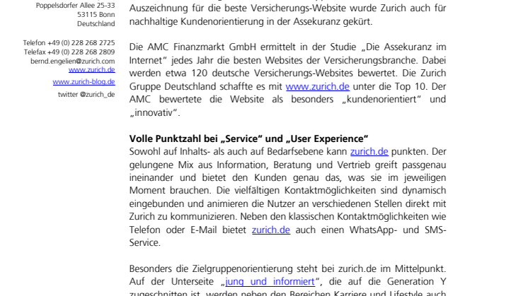 Die AMC Finanzmarkt GmbH ermittelt in der Studie „Die Assekuranz im Internet“ jedes Jahr die besten Websites der Versicherungsbranche. Dabei werden etwa 120 deutsche Versicherungs-Websites bewertet. Die Zurich Gruppe Deutschland schaffte es mit www.zurich.de unter die Top 10. Der AMC bewertete die Website als besonders „kundenorientiert“ und „innovativ“.