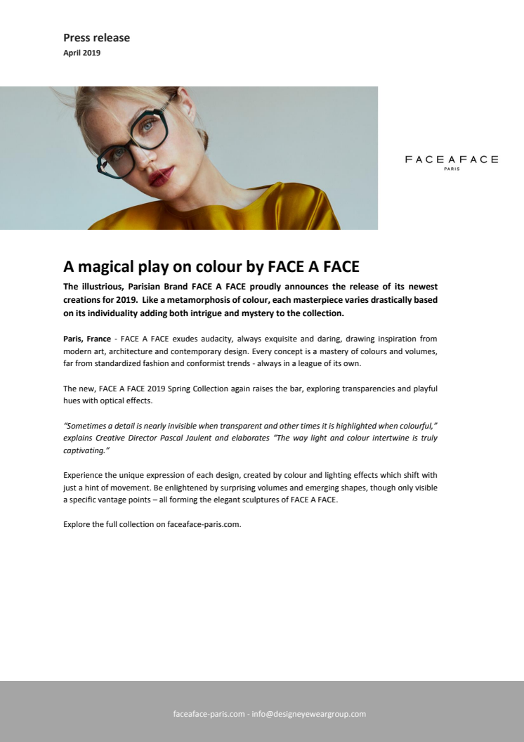 The illustrious Parisian brand FACE A FACE proudly announces the release of its newest creations for 2019. Like a metamorphosis of colour, each masterpiece varies drastically based on its individuality adding both intrigue and mystery to the collection.