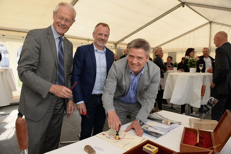 Køges borgmester skriver sammen med Arkitektgruppens administrerende direktør og udviklingdirektør i Dades under på grunddokumentet inden det forsejles og mures ind i ejendommen.