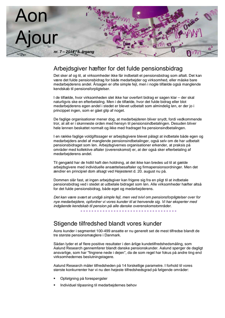 Aon Ajour 7-2014: Arbejdsgiver hæfter for det fulde pensionsbidrag