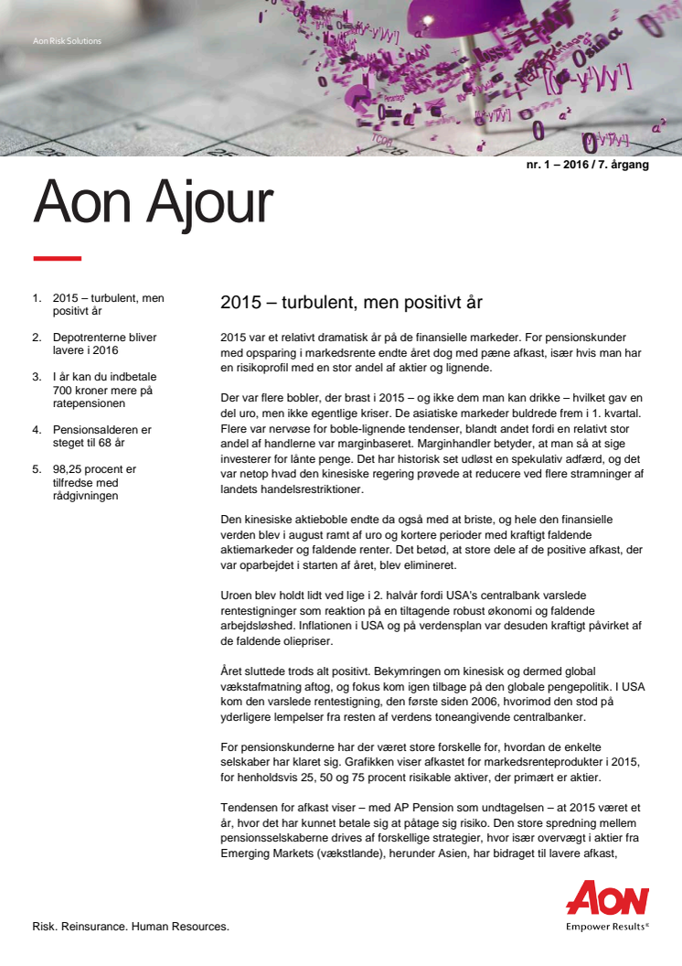 Aon Ajour 1-2016: 2015 – turbulent, men positivt år for mange pensionskunder