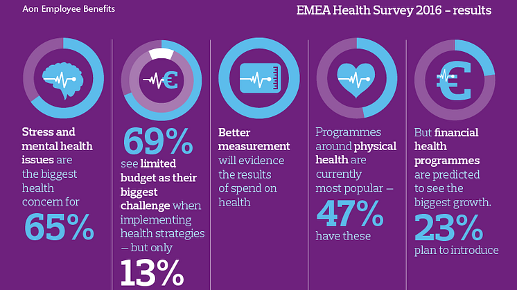 En ny sundhedsundersøgelse fra Aon Risk Solutions viser, at 93 % af arbejdsgiverne i Europa, Mellemøsten og Afrika (EMEA-regionen) ser en sammenhæng mellem sundhed og medarbejdernes præstationer. Men kun 13 % af respondenterne måler outputtet af deres eksisterende sundhedsstrategier for medarbejdere, og 69 % svarer, at begrænsede budgetter er den største udfordring i forhold til implementering af sundhedsstrategier.