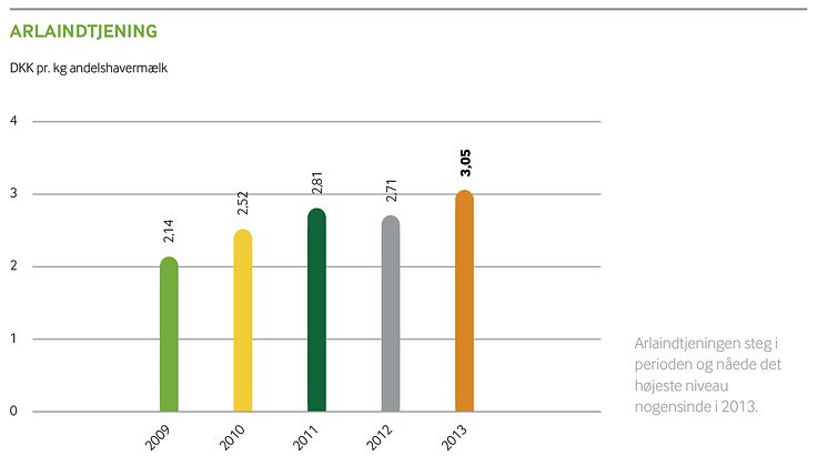 Grafik over udviklingen i Arlaindtjeningen siden 2009 og frem til og med 2013