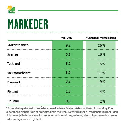 Grafik med oversigt over de største markeder i Arla koncernen (ikke komplet liste over alle markeder) målt ifht. omsætning.
