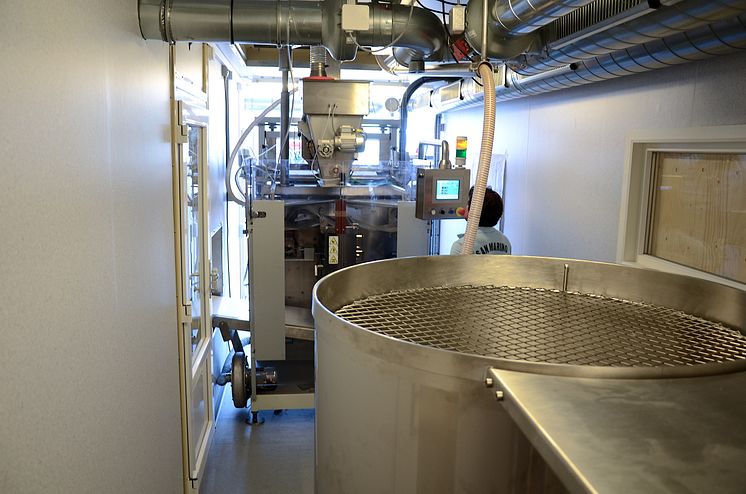 Mælkepulveret leveres af danske Akafa. Sækkene tømmes i en stor tragt, som via et lukket rørsystem sender mælkepulveret til en posefylder. Her pakkes pulveret i forbrugerpakninger á 25 gram, svarende til 1 glas mælk