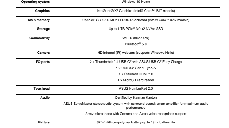 ZenBook 13 OLED features an ASUS ClearVoice Mic with AI-trained noise-canceling technology to ensure clear voice outgoing communications in online meetings or internet voice calls. They also use ASUS ClearVoice Speaker technology to filter out ambient noise from incoming audio streams.
