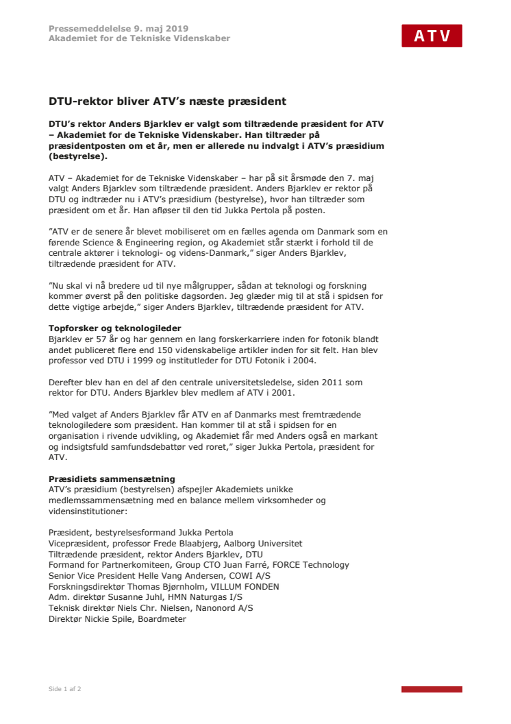DTU’s rektor Anders Bjarklev er valgt som tiltrædende præsident for ATV – Akademiet for de Tekniske Videnskaber. Han tiltræder på præsidentposten om et år, men er allerede nu indvalgt i ATV’s præsidium (bestyrelse). Han afløser til den tid Jukka Pertola på posten.