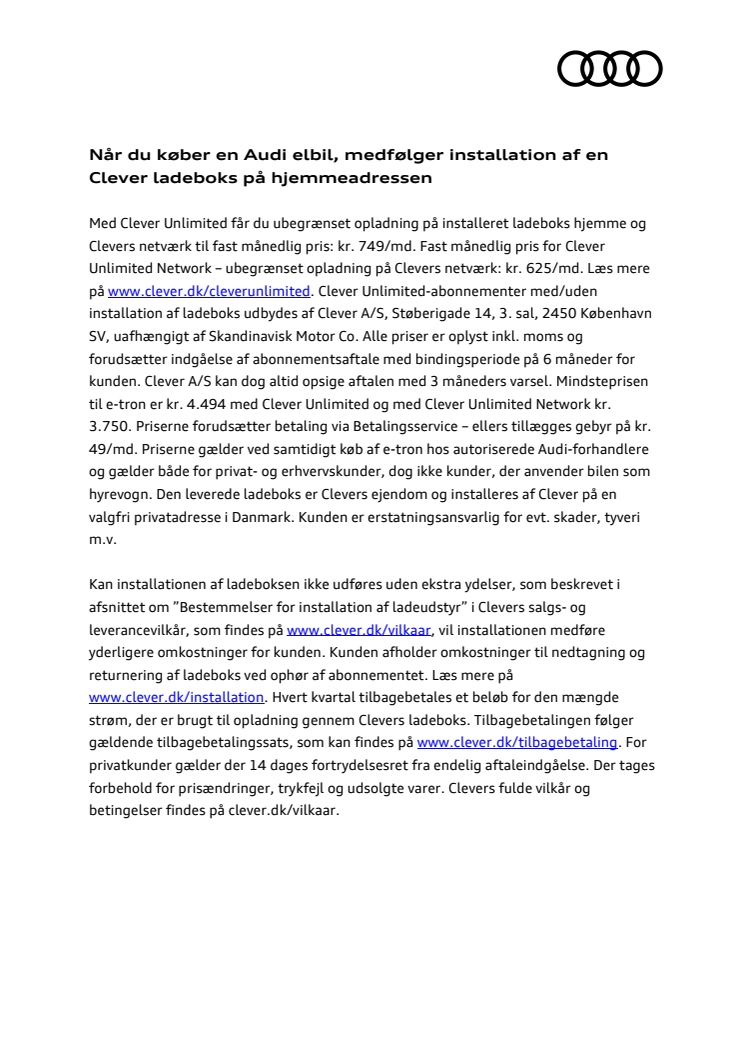 Når du køber en Audi elbil, medfølger installation af en Clever ladeboks på hjemmeadressen