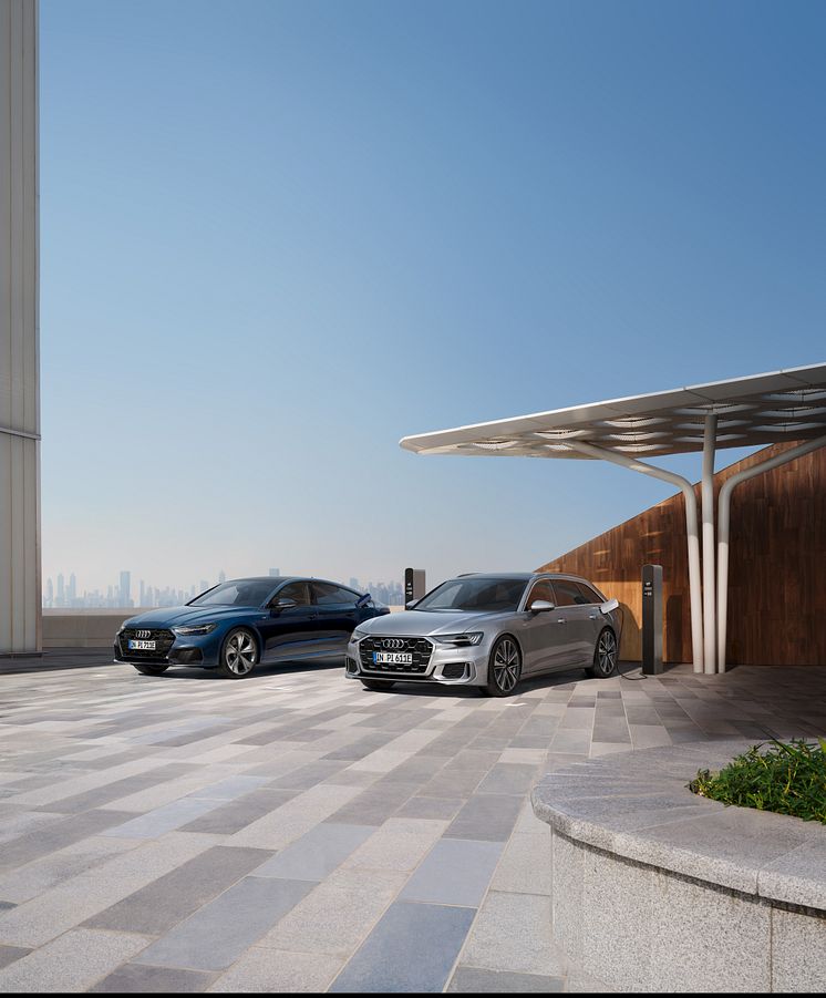 Audi A6 Avant TFSI e (Florettsølv), A7 Sportback TFSI e (Firmamentblå)
