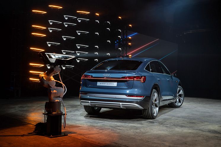 Audi e-tron Sportback (Plasmablå metallak) med digitale Matrix LED-forlygter har verdenspremiere på LA Auto Show 2019