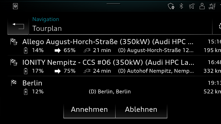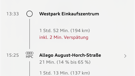 Audi e-tron-ruteplanneren udvider i fuldt elektriske modeller de velkendte navigationsfunktioner i Audi MMI (Multi Media Interface) med specifikke features vedr. elbilskørsel – især på mellemlange og lange distancer. e-tron-ruteplanneren beregner den hurtigste rute, tager hensyn til trafik- og rutedata, tager hensyn til førerens kørestil, beregner varigheden af ladestop og tager den med i planlægningen af den samlede køretid. Brugeren får vigtige informationer som fx ladeeffekt, ladetilslutning og stiktype for de pågældende ladepunkter. Derudover viser systemet den dynamiske tilgængelighed – dvs. om ladestandere er ledige eller optaget. Det primære fokus er hele tiden på at komme hurtigt frem, og her kan fx to korte opladninger med en høj ladeeffekt give en tidsmæssig fordel frem for et langt stop med en lav ladeeffekt. Der tages også hensyn til alternative strækninger med bedre ladeinfrastruktur i forbindelse med beregningen af den optimale samlede køretid. Audi e-tron-ruteplanneren foretrækker i den forbindelse de kraftige HPC-ladestationer (HPC = High Power Charging). De kan fx oplade batteriet i Audi e-tron 55 med op til 150 kW jævnstrøm (DC). Under ideelle forhold tager det kun ca. en halv time at lade op fra 5 til 80 % af batterikapaciteten. En push-besked via myAudi-appen viser føreren, når den ønskede ladetilstand er nået, og turen kan fortsætte.