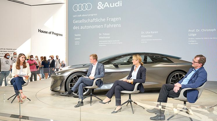 På Wittelsbacher Platz i München blev der derfor afholdt en debat med deltagelse af Uta Karen Klawitter, chef for den centrale juridiske afdeling hos AUDI AG, Tobias Miethaner, afdelingsleder for ”Digitale Gesellschaft” i det tyske trafikministerium, Christoph Lütge, som er direktør for Institut für Ethik inden for kunstig intelligens på det tekniske universitet i München, og Saskia Lexen, som er projektleder i &Audi Initiative hos AUDI AG.