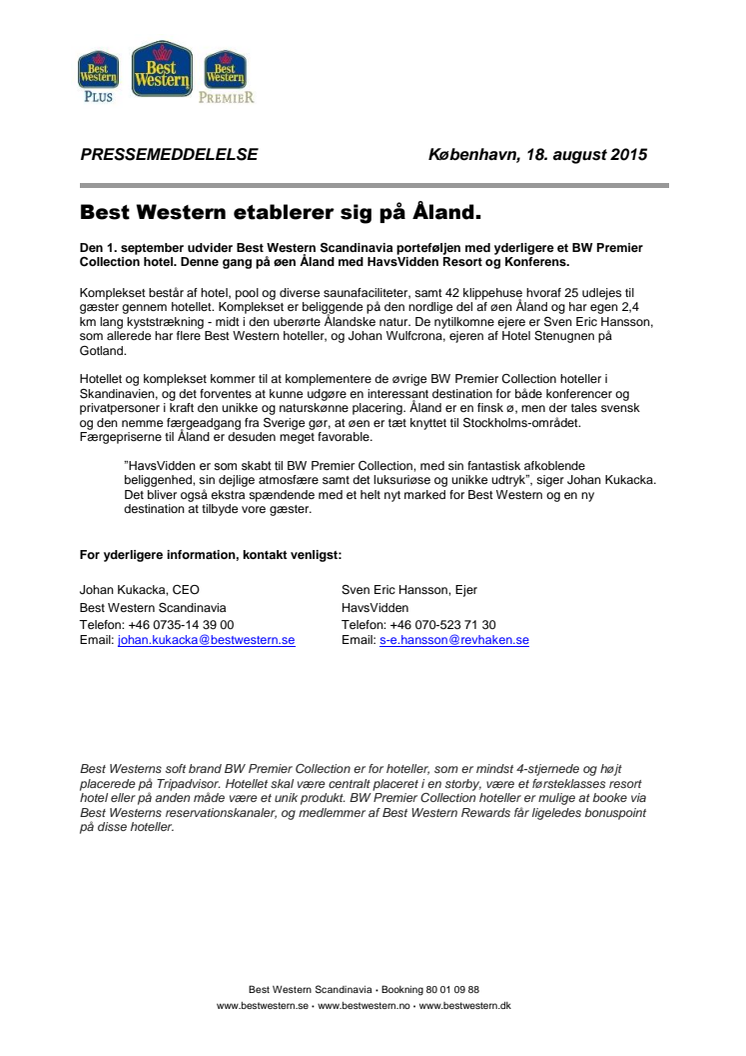 Den 1. september udvider Best Western Scandinavia porteføljen med yderligere et BW Premier Collection hotel. Denne gang på øen Åland med HavsVidden Resort & Konferens. Komplekset består af hotel, pool og diverse saunafaciliteter, samt 42 klippehuse hvoraf 25 udlejes til gæster gennem hotellet.