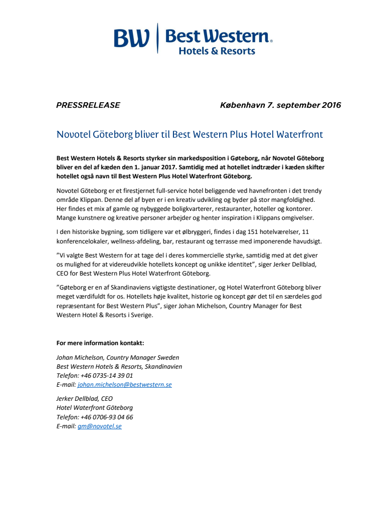 Best Western Hotels & Resorts styrker sin markedsposition i Gøteborg, når Novotel Göteborg bliver en del af kæden den 1. januar 2017. Samtidig med at hotellet indtræder i kæden skifter hotellet også navn til Best Western Plus Hotel Waterfront Göteborg.