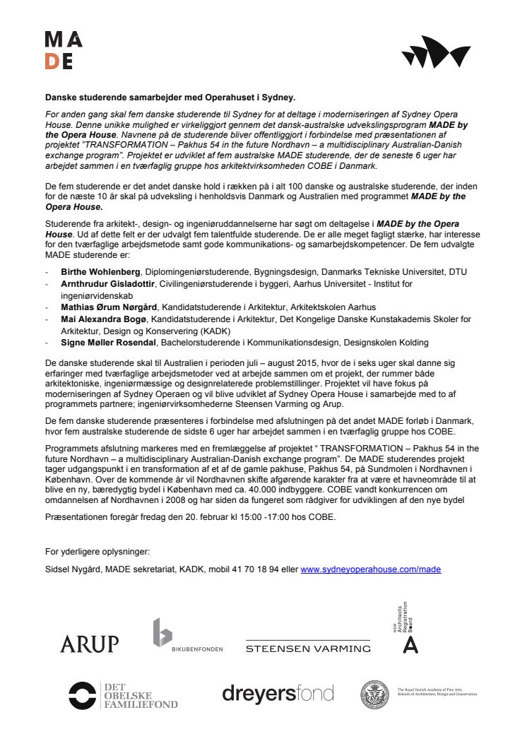 For anden gang skal fem danske studerende til Sydney for at deltage i moderniseringen af Sydney Opera House. Denne unikke mulighed er virkeliggjort gennem det dansk-australske udvekslingsprogram MADE by the Opera House. Navnene på de studerende bliver offentliggjort i dag.