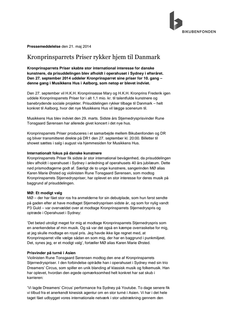 Kronprinsparrets Priser skabte stor international interesse for danske kunstnere, da prisuddelingen blev afholdt i operahuset i Sydney i efteråret. Den 27. september 2014 uddeler Kronprinsparret sine priser for 10. gang – denne gang i Musikkens Hus i Aalborg, som netop er blevet indviet.