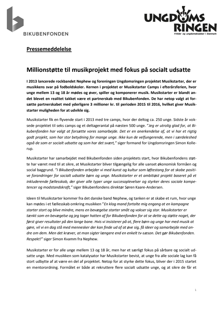 Musikstarter er blandt andet blevet en realitet takket være et partnerskab med Bikubenfonden. Fonden har netop valgt at forsætte partnerskabet med yderligere 3 millioner kr. til perioden 2015 til 2016, hvilket giver Musikstarter muligheden for at udvikle sig.