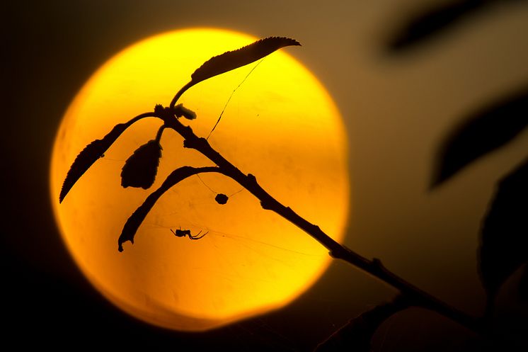 En tæppespinder i smuk silhuet foran aftensolen. Madpakken hænger klar til at blive indtaget, mens solen synker ned bag Svanninge Bjerge.