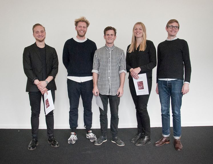Vinderne af Bikubenfondens konkurrence for arkitekturstuderende. Fra venstre: Jakob Franijeur Holmqvist-Larsen (1. plads), Aske Beha Busch og Sune Marxen (2. plads), Karina K. Foldberg og Erik Oskar Lundahl (3. plads).
