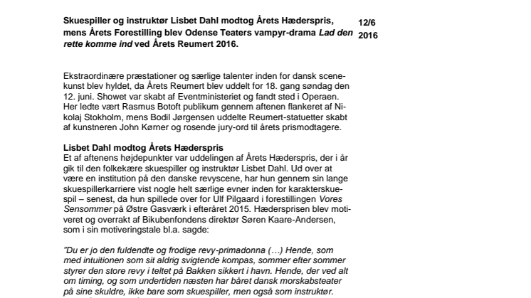 Den folkekære skuespiller og instruktør Lisbet Dahl modtager Årets Hæderspris 2016.