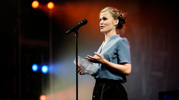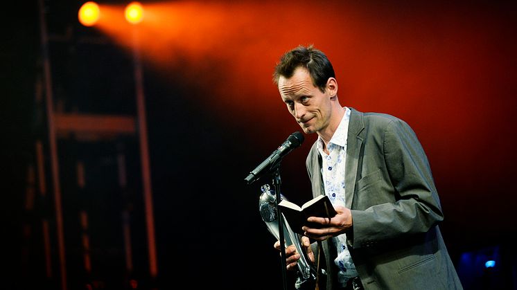 Årets Dramatiker 2016 går til Peter Asmussen for den dystre tableau-forestilling ’Soli Deo Gloria’ på Betty Nansen Teatret. Dramatiker, instruktør og teaterleder Simon Boberg modtager her prisen.