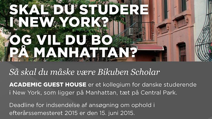 Der er nu åbent for ansøgninger til Academic Guest House for efterårssemestret for danskere, der skal studere i New York på efterårssemestret. Ansøgningsfristen for at blive "Bikuben Scholar" er 15. juni.