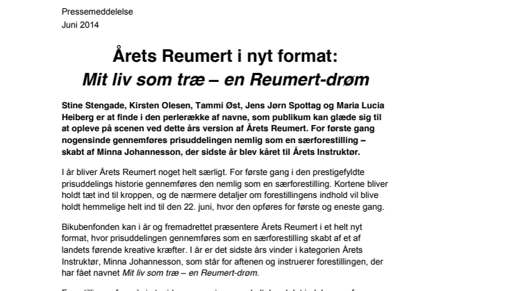 Bikubenfonden kan i år og fremadrettet præsentere Årets Reumert i et helt nyt format, hvor prisuddelingen gennemføres som en særforestilling skabt af et af landets førende kreative kræfter. I år er det sidste års vinder i kategorien Årets Instruktør, Minna Johannesson, som står for aftenen og instruerer forestillingen, der har fået navnet Mit liv som træ – en Reumert-drøm.