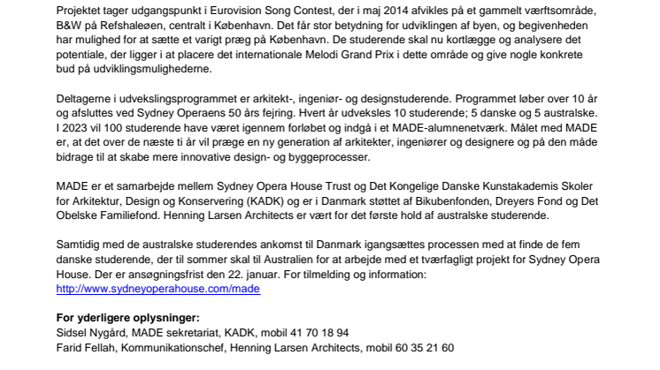 MADE er et samarbejde mellem Sydney Opera House Trust og Det Kongelige Danske Kunstakademis Skoler for Arkitektur, Design og Konservering (KADK) og er i Danmark støttet af Bikubenfonden, Dreyers Fond og Det Obelske Familiefond. Henning Larsen Architects er vært for det første hold af australske studerende.