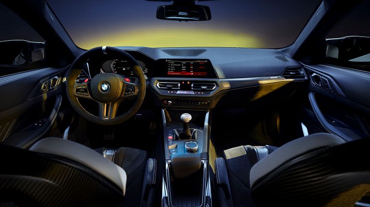 Også interiøret i den helt nye BMW 3.0 CSL understreger letvægtskonstruktionen. I stedet for bagsæder finder man et opbevaringsrum med to integrerede rum til hjelme. CFRP-lister i dørpanelerne og den reducerede akustiske isolation bidrager også til den ekstremt sportslige følelse. Fører og passager sidder i formstøbte kulfibersæder, som formidler den umiskendelige racing-følelse for hver kilometer, der køres. De eksklusive interiørkomponenter i CFRP produceres med håndkraft.