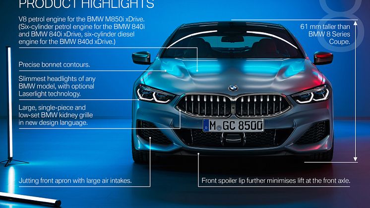 Lanceringen i september byder på fire modelvarianter: BMW 840i Gran Coupé med sekscylindret benzinmotor og 340 hestekræfter, BMW 840i xDrive Gran Coupé med firehjulstræk, sekscylindret benzinmotor og 340 hestekræfter, BMW M850i xDrive Gran Coupé med firehjulstræk, V8-benzinmotor og 530 hestekræfter samt BMW 840d xDrive Gran Coupé med firehjulstræk og sekscylindret dieselmotor med 320 hestekræfter. Alle modeller kommer med ottetrins Steptronic automatgearkasse.