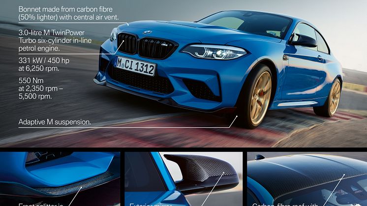Under motorhjelmen af kulfiberforstærket plast (CFRP) med centralt luftindtag ligger der en 3,0 liters M TwinTurbo-rækkesekser, som yder 450 hestekræfter – 40 hestekræfter mere end i BMW M2 Competition. Kræfterne leveres til baghjulene og bilen kommer standard med Michelin Pilot Sport Cup 2-dæk.