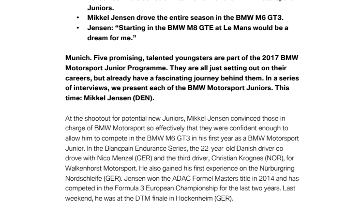 At the shootout for potential new Juniors in Miramas, Mikkel Jensen convinced those in charge of BMW Motorsport so effectively that they were confident enough to allow him to compete in the BMW M6 GT3 in his first year as a BMW Motorsport Junior. In the Blancpain Endurance Series, the 22-year-old Danish driver will co-drive with Menzel and the third driver, Christian Krognes, for Walkenhorst Motorsport. Jensen won the ADAC Formel Masters title in 2014 and has competed in the Formula 3 European Championship for the last two years. "I am proud of having made the leap to the BMW Motorsport Junior Programme," says Jensen. "I managed the new BMW M4 GT4 very well in the shootout. It is unbelievable to get the chance to gather experience in the BMW M6 GT3 right from the start."