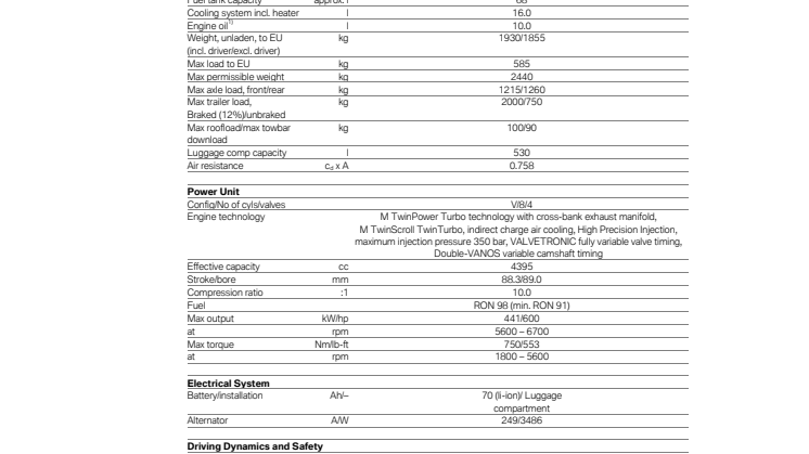 V8-motoren på 4,4 liter med M TwinPower Turbo-teknologi har 600 hestekræfter og et maksimalt drejningsmoment på 750 Nm. Brændstofforbruget ved blandet kørsel er på 9,5 km/l og CO2-udledningen er 241 g/km.