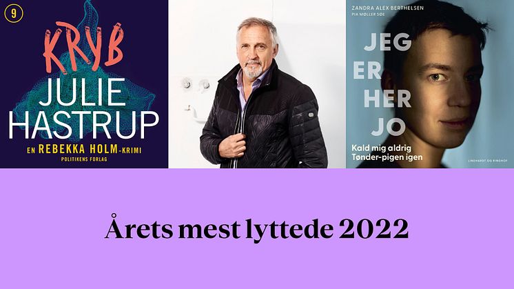 Både anden- og tredjepladsen på årets top-10 mest lyttede bøger er danske. Lige i hælene på Jussi Adler-Olsen finder vi nemlig Julie Hastrup med bogen Kryb, som er niende bind i en populær krimiserie. Tredjepladsen indtages i år af den længe ventede Jeg er her jo, om den meget omtalte Tønder-sag. Bogen balancerer i det populære spændingsfelt mellem biografi og true crime og er skrevet af Zandra Berthelsen og Pia Møller Søe.